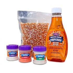 Perfect for use with Nostalgia Electrics hot air and kettle poppers. Contains one pound of popcorn and 10 ounces of butter flavored oil. Three 10-ounce jars of our delicious seasonings.